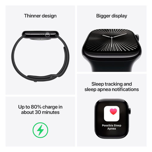 ساعت هوشمند اپل مدل Series 10 با ابعاد 46x39x9.7 میلیمتر و وزن 35.3 گرم، محصولی مناسب برای آقایان و بانوان است که هم در فعالیتهای روزمره و هم در موقعیتهای رسمی و ورزشی قابل استفاده است. جنس بدنه این ساعت از آلومینیوم بوده و در ساخت آن از شیشه Ion-X و سرامیک سافایر بهره گرفته شده است. صفحه نمایش 1.96 اینچی آن از نوع Retina LTPO3 OLED با وضوح 416x496 پیکسل و تراکم 326 پیکسل بر اینچ بوده که قابلیت روشنایی بین 1 تا 2000 نیت را دارد. این ساعت با سیستم عامل WatchOS نسخه 11 و پردازنده Apple S10 عرضه شده و از فناوریهای مکانیابی GPS، A-GPS، GLONASS، GALILEO، BDS و QZSS پشتیبانی میکند. ساعت هوشمند اپل مجهز به حسگرهای متعددی از جمله قطبنما، شتابسنج، ضربان قلب، سنجش اکسیژن خون، ژیروسکوپ، ارتفاعسنج و سنجش دمای بدن است. همچنین، قابلیت نمایشگر همیشه روشن، پایش وضعیت خواب، محاسبه کالری مصرفی و مسافت طیشده، تشخیص تصادف و سقوط از ارتفاع و پشتیبانی از Siri از دیگر ویژگیهای این محصول است. باتری لیتیوم یونی این ساعت با یک بار شارژ میتواند تا 18 ساعت در حالت عادی و 36 ساعت در حالت ذخیره انرژی کار کند. بهعلاوه، این ساعت در برابر آب تا عمق 50 متر مقاوم است و دارای گواهی IPX6 برای مقاومت در برابر گرد و غبار است. گفتنیست که قابلیت استفاده از سنسور اکسیژن خون وجود ندارد.